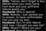 Valerie greets you.” Husband: “Who is Valerie?” Wife: “Nobody, I just wanted you to answer, to have confirmation that you saw my text.” Husband: “But I’m with Valerie right now,