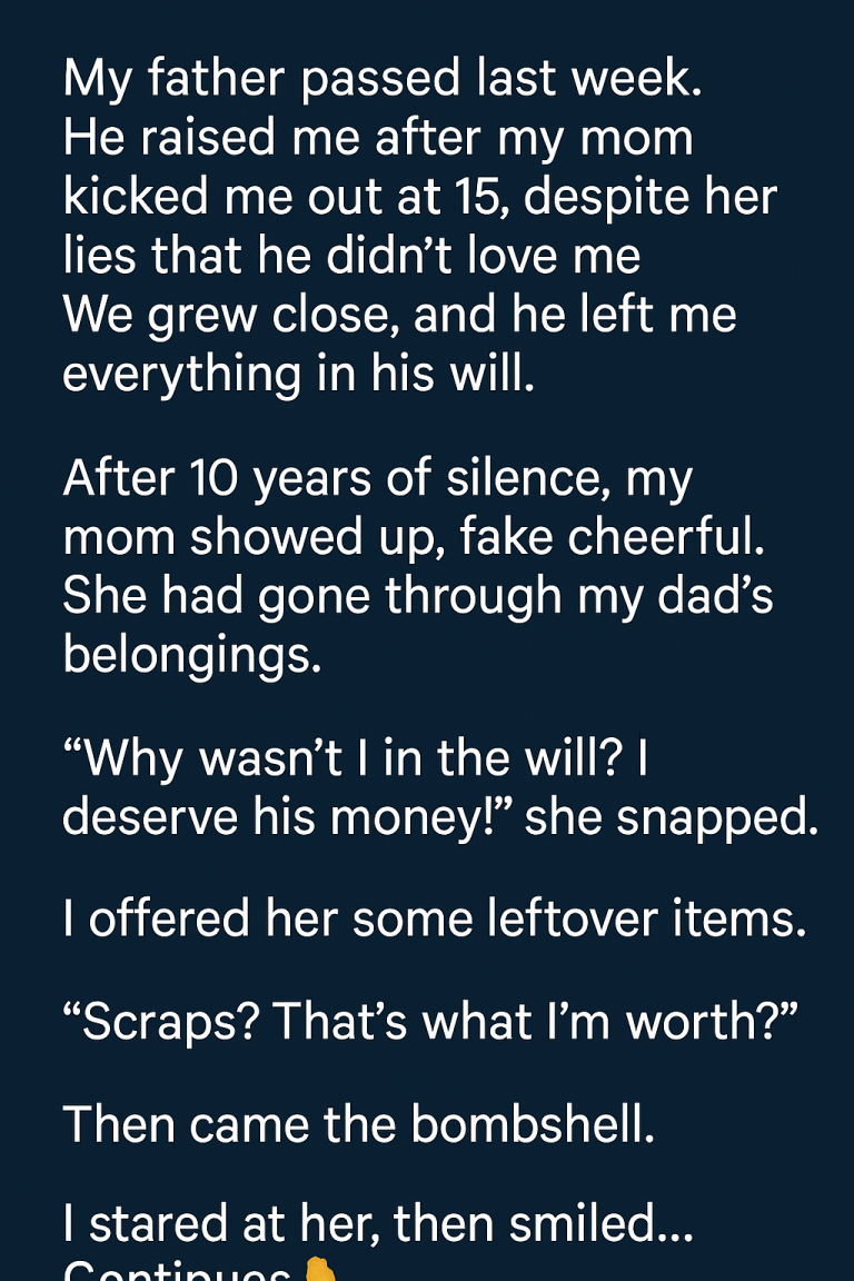 When my dad passed away, it felt like my world cracked open. He wasn’t just my father—he was my rescuer, my anchor, the man who found me when my mother kicked me out at fifteen with nothing but a backpack and a cold lecture about “tough love.”