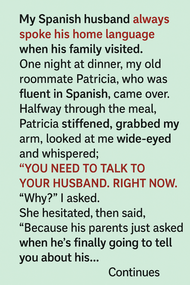 When my Spanish husband spoke to his parents, I never questioned the language barrier — until my friend, fluent in Spanish, joined us for dinner. Halfway through the meal, she grabbed my arm, eyes wide with horror. “You need to talk to your husband. Right now.”