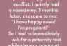 I apologized endlessly, but I couldn’t bring myself to tell her why I had doubted her. To this day, she doesn’t know about the vasectomy. She only knows her husband accused her of cheating when she was carrying his child.
