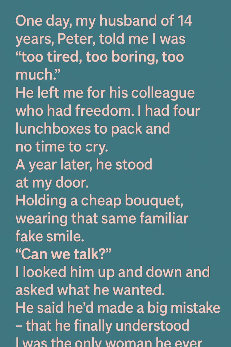 After 14 years, Peter told me I was “too tired, too boring, too much,” and left me — and our four kids — for his carefree colleague. No warning, just a text. A year later, as I was finally healing, he showed up at my door with a cheap bouquet and a request that changed everything.