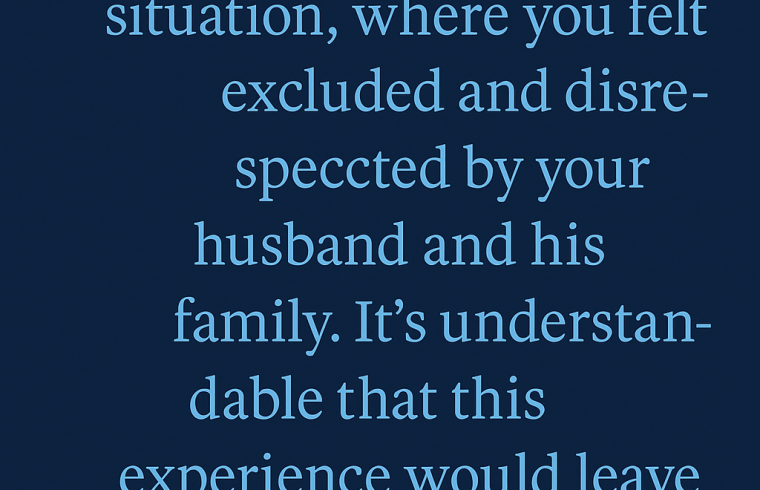 The concerning part is that instead of standing beside you, he tried to justify their behavior. That choice didn’t just invalidate your feelings—it weakened the foundation of trust between you. To heal this rift, communication with your husband is essential. He needs to hear, in clear terms, how the exclusion made you feel and why you left. He also needs to understand that you weren’t being “ungrateful” for the trip, but rather reacting to feeling belittled and unwelcome. His silence and inaction were part of the hurt, and acknowledging that is crucial if things are to improve.