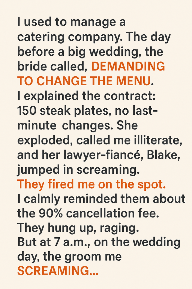 “Sir,” I said sweetly, “you fired us yesterday. If you want catering today, that’s a new contract at our same-day emergency rate—three times the original. Payment upfront. Menu based on available inventory. Steak only.”