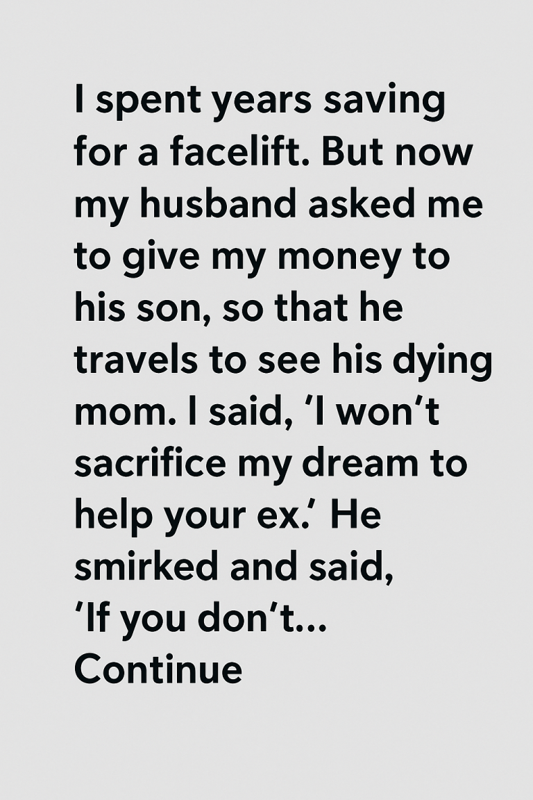 Then, out of nowhere, my husband asked if I’d give that money to his son, Liam, so he could travel to see his dying mom.