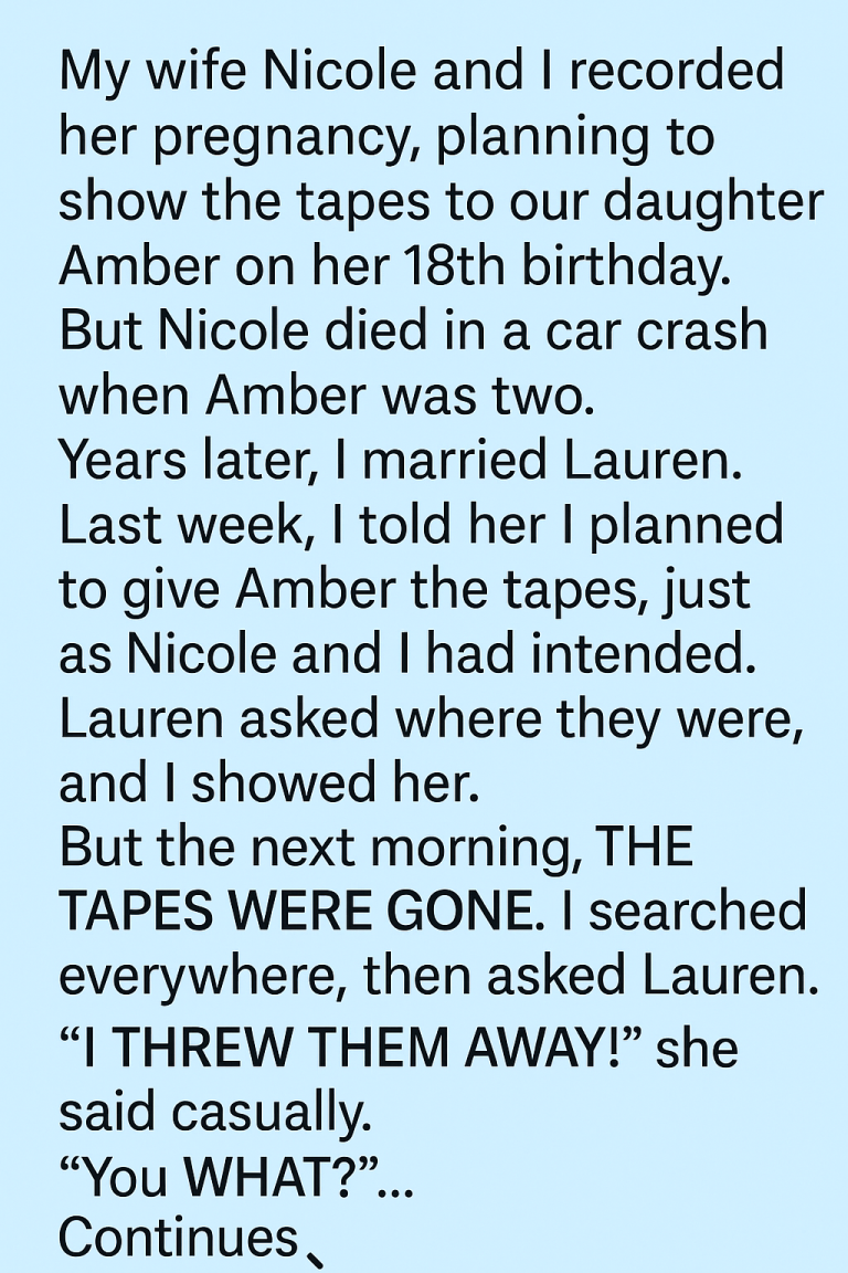I kept my late wife’s memory alive through videotapes. Her voice, her laughter, her love—all preserved for the daughter she never got to raise. Those tapes were meant to be a gift for Amber’s 18th birthday. But when I went to retrieve them, they were gone. And what my new wife confessed left me frozen, heartbroken… and in tears.