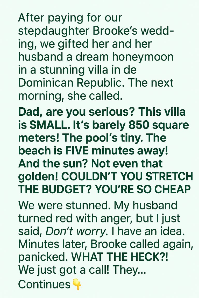To top it off, we decided to gift Brooke and her husband, Mason, a honeymoon they’d never forget — a luxurious villa in the Dominican Republic with a private pool, panoramic ocean views, and every comfort imaginable. It cost more than we’d planned, but Gary and I felt it was a final act of love as she began her new life.
