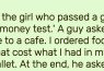 it well. She got into that university and rented a place near his neighborhood. My mom rolls her eyes, but I’m very happy for her. Yes, she is obsessed with this actor, but this motivation helped her change her life. She’s been living in Spain for a few years now, still a fan, and her new boyfriend is okay with it. I’m proud of her. STORY2 : I’m the girl who passed a man’s “money test.” A guy asked me to a,
