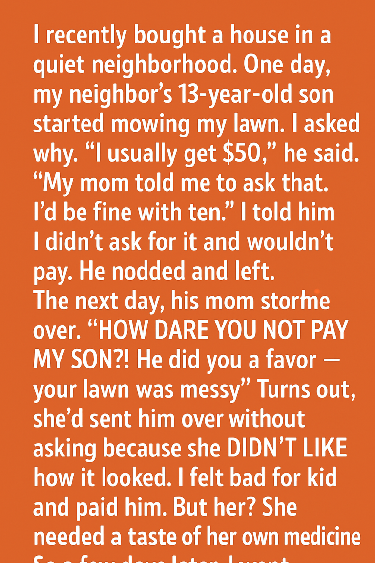 Homeownership is an American dream… until your neighbor decides your lawn is her business. Mine sent her son to mow it without asking — then demanded $50. I refused and gave her a taste of her own logic. Some lessons hit hardest when the mirror turns back on you.