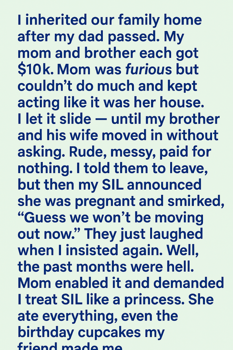 Then came my brother, Tyler, and his wife, Gwen. They arrived with eight suitcases and matching fake smiles. “Rent’s a waste,” they said, as if that somehow made it my problem. Mom encouraged it, chirping, “It’ll be nice having everyone together again!”