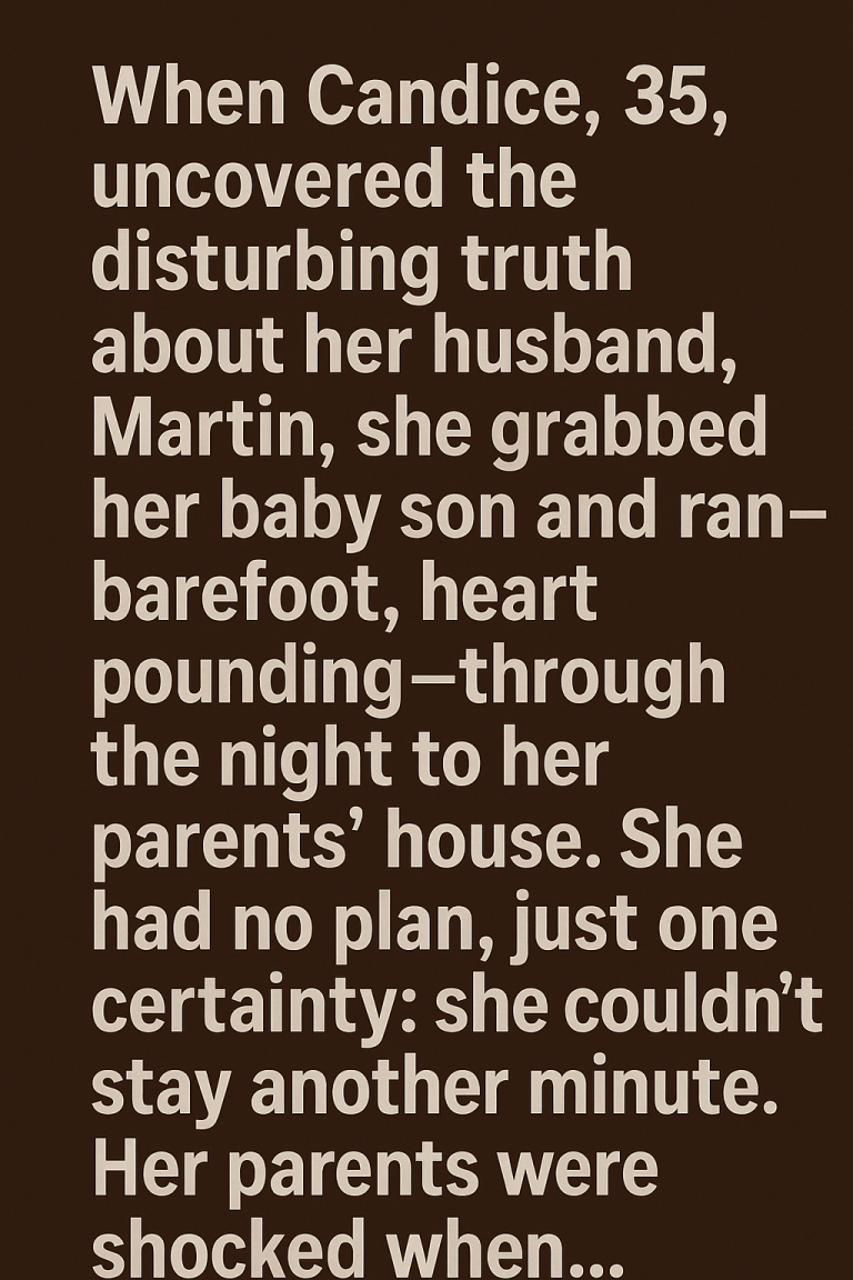 When Candice, 35, uncovered the disturbing truth about her husband, Martin, she grabbed her baby son and ran — barefoot, heart pounding — through the night to her parents’ house. Gravel sliced her feet, the cold air burned her lungs, but she didn’t stop. She had no plan, no bag, nothing but her infant pressed to her chest. The only thing she knew was that she couldn’t stay another minute.
