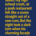 Reuniting with Jason, my high school crush, at a posh restaurant felt like a scene straight out of a rom-com. But the night took a dark turn when his charming façade cracked, revealing a shocking…