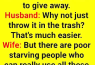 Husband: “Why not just throw it in the trash? That’s much easier.” Wife: “But there are poor, starving people who can really use all these clothes.” Husband: “Honey, anyone who fits into your clothing is…