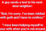 A man, overwhelmed with guilt, sent a confessional text to his next-door neighbor, Bob: “Bob, I’m sorry. I’ve been riddled with guilt and I need to confess: I’ve been helping myself to your wife when…