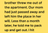I was 19 when my older brother threw me out of the apartment. Our mom had just passed away and left him the place in her will. Less than a month later, he told me…