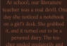 At school, our literature teacher was a real devil. One day she noticed a notebook on a girl’s desk. She grabbed it, and it turned out to be a personal diary. The teacher smiled predatorily…
