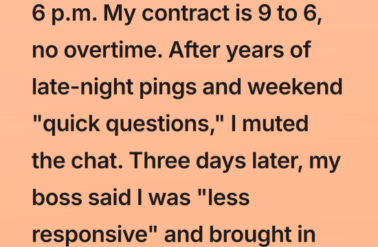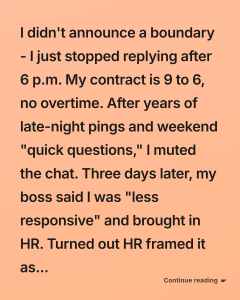 I didn’t announce a boundary—I just stopped replying after 6 p.m. My contract is 9 to 6, no overtime. After years of late-night pings and weekend “quick questions,” I finally reached my limit and muted…