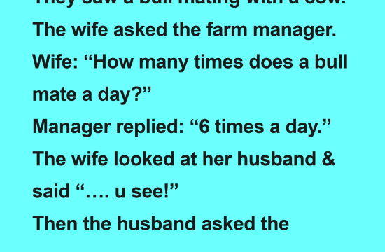 A husband & wife visited a farm. They saw a bull mating with a cow. The wife asked the farm manager. Wife: “How many times does a bull mate a day?” Manager replied: “6 times…