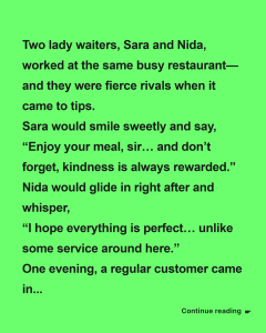 Two lady waiters, Sara and Nida, worked at the same busy restaurant—and they were fierce rivals when it came to tips. Sara would smile sweetly and say,“Enjoy your meal, sir… and don’t forget, kindness is…