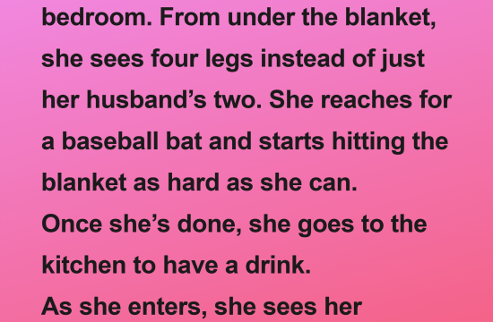 A wife comes home late one night and quietly opens the door to her bedroom. From under the blanket, she sees four legs instead of just her husband’s two. She reaches for a baseball bat…