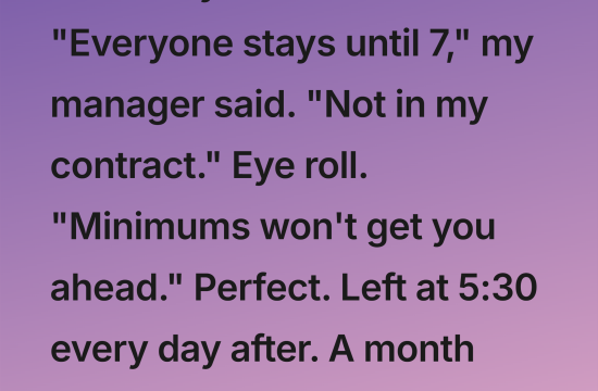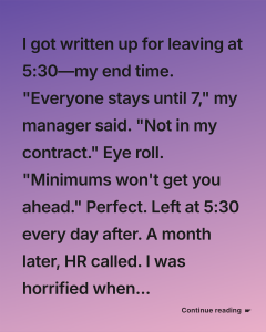 I was written up for leaving at 5:30—my exact contracted end time. My manager called me into her office, visibly annoyed, and said, “Everyone stays until at least 7. It shows commitment.” Her tone made…