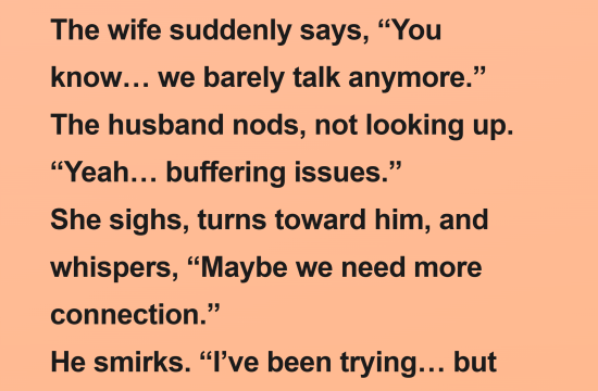 A couple was lying in bed, both scrolling their phones in silence.The wife suddenly says, “You know… we barely talk anymore.” The husband nods, not looking up. “Yeah… buffering issues.” She sighs, turns toward him,…