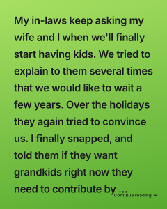 My in-laws keep asking my wife and I when we’ll finally start having kids. We tried to explain to them several times that we would like to wait a few years, but every explanation felt…