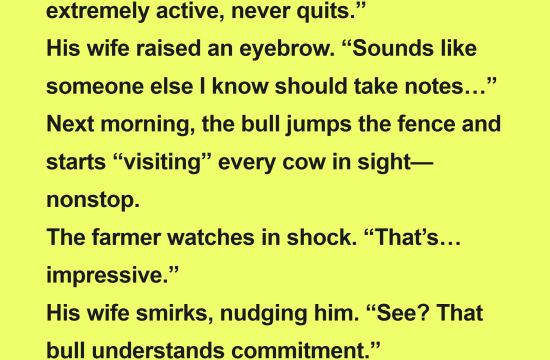 A farmer bought a new bull after reading reviews online—“High performance, extremely active, never quits.”His wife raised an eyebrow. “Sounds like someone else I know should take notes…” Next morning, the bull jumps the fence…
