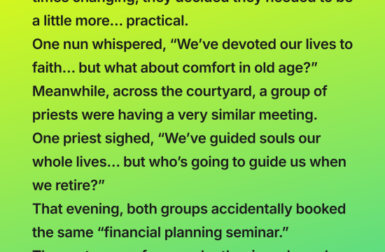 At a quiet monastery, a group of nuns gathered to discuss their “future security plans.” With times changing, they decided they needed to be a little more… practical. One nun whispered, “We’ve devoted our lives…