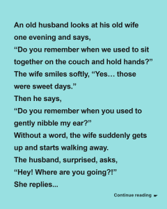An old husband looks at his old wife one evening and says,“Do you remember when we used to sit together on the couch and hold hands?” The wife smiles softly, “Yes… those were sweet days.”…