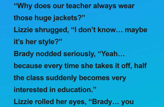 Brady leaned over to Lizzie during class and whispered,“Why does our teacher always wear those huge jackets?” Lizzie shrugged, “I don’t know… maybe it’s her style?” Brady nodded seriously, “Yeah… because every time she takes…