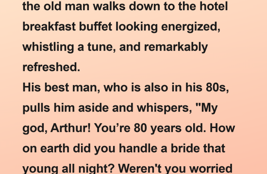 An 80-year-old man marries a 25-year-old woman. After their wedding night, the old man walks down to the hotel breakfast buffet looking energized, whistling a tune, and remarkably refreshed. His best man, who is also…