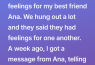 My boyfriend broke up with me because he had feelings for my best friend Ana. We hung out a lot, and they said they had feelings for one another. They admitted that Josh had been cheating on me. They made a fool out of me. They made me think that everything was okay when it was really not.
