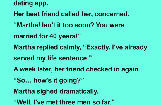 After her husband passed away, 62-year-old Martha shocked everyone by joining a dating app. Her best friend called her, concerned.“Martha! Isn’t it too soon? You were married for 40 years!” Martha replied calmly,“Exactly. I’ve already…