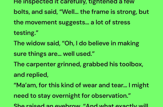 A carpenter was called by a charming widow to fix a squeaky bed in her bedroom. He inspected it carefully, tightened a few bolts, and said, “Well… the frame is strong, but the movement suggests……