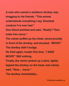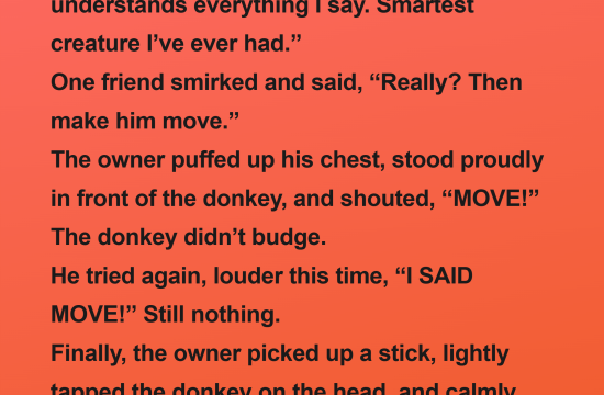 A man who owned a stubborn donkey was bragging to his friends, “This animal understands everything I say. Smartest creature I’ve ever had.” One friend smirked and said, “Really? Then make him move.” The owner…