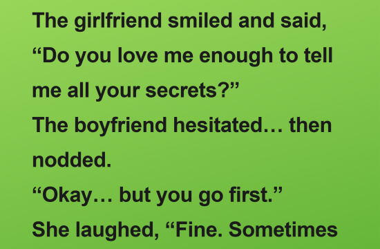 So a boyfriend and girlfriend were lying on the couch, cuddling. The girlfriend smiled and said,“Do you love me enough to tell me all your secrets?” The boyfriend hesitated… then nodded.“Okay… but you go first.”…