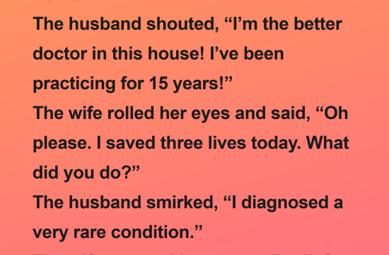 A doctor husband and his doctor wife were having a serious argument at home. The husband shouted, “I’m the better doctor in this house! I’ve been practicing for 15 years!” The wife rolled her eyes…