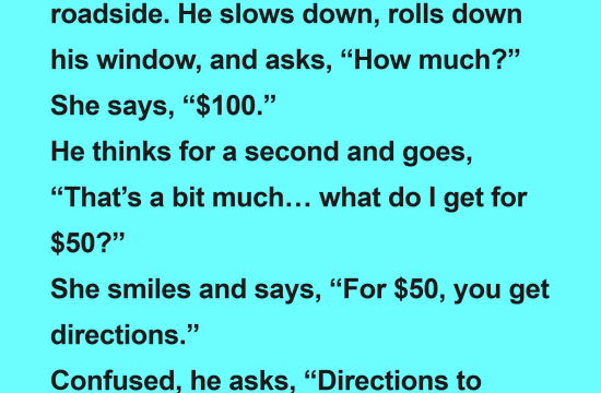 A guy is driving late at night when he sees a sex worker standing by the roadside. He slows down, rolls down his window, and asks, “How much?” She says, “$100.” He thinks for a…