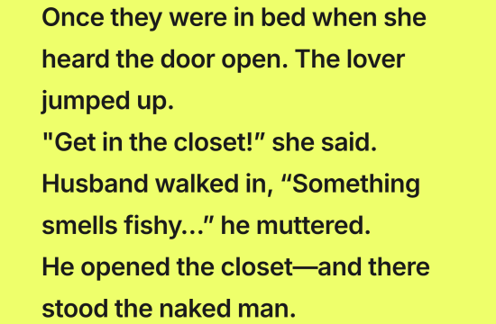 A woman was secretly cheating on her husband with her lover… and one afternoon, they were in bed together when suddenly she heard the front door open. “OH NO—it’s my husband!” she panicked. The lover…
