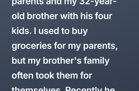 We live together with my parents and my 32-year-old brother with his four kids. I used to buy groceries for my parents, but my brother’s family often took them for themselves. Recently he questioned why…