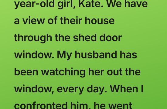Our new neighbor is a 19-year-old girl, Kate. We have a view of their house through the shed door window. My husband has been watching her out the window, every day. When I confronted him,…