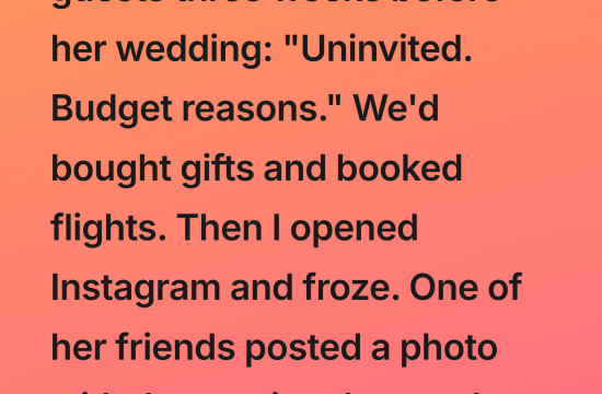 The text from my cousin Jessica was cold. A wall of words to thirty different people. “Due to unforeseen budget cuts, we have to shrink our guest list. We are so, so sorry.” Sorry. My…