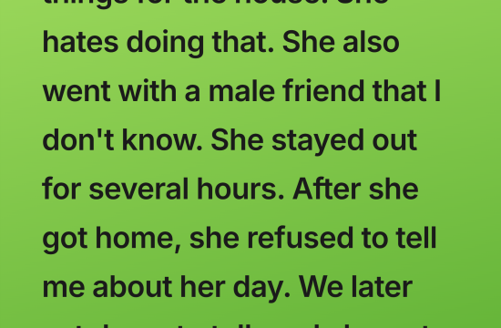 My wife went out to buy things for the house. She hates doing that. She also went with a male friend that I don’t know. She stayed out for several hours. After she got home,…