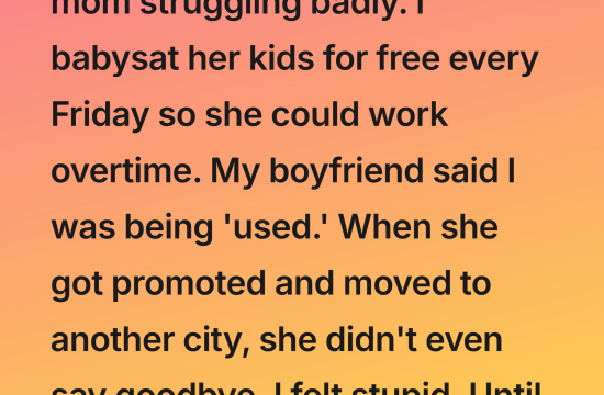 I had been watching Maya’s two boys – Lucas and Ethan – every Friday for almost three years. Not for money. For nothing. My boyfriend Derek used to say I was a sucker. “She’s milking…