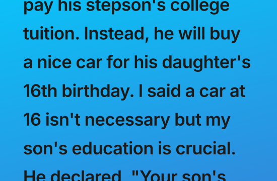 My husband is refusing to pay his stepson’s college tuition. Instead, he will buy a nice car for his daughter’s 16th birthday. I said a car at 16 isn’t necessary but my son’s education is…