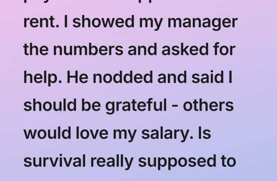 I work full-time, yet my paycheck disappears into rent. I showed my manager the numbers and asked for help. He nodded and said I should be grateful—others would love my salary. Is survival really supposed…