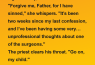 The priest lets out a long, shaky breath and says, “To be honest, Sister, I’m just trying to figure out how many ‘Hail Marys’ it’s going to take for me to stop wishing I’d gone to med school.”