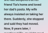 When my daughter was 7, she had sleepovers at her friend Tia’s home and loved her dad’s pasta. My wife always insisted on taking her there.