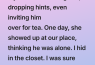 A friend started hitting on my husband: texting him, dropping hints, even inviting him over for tea. One day, she showed up at our place thinking he was alone. I hid in the closet. I was sure she was going to make a move, but she brought in a pile of balloons.
