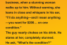 A guy is sitting at a high-end bar, sipping his drink and minding his own business, when a stunning woman walks up to him. Without warning, she leans in close and whispers in his ear, “I’ll do anything—and I mean anything—you want for $200… on one condition.”